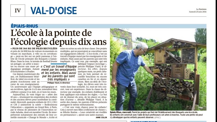 « Plus de 364 kg de piles recyclées et près de 24 000 km de voitures économisées en venant en marchant, à vélo ou en covoiturage » peut-on lire sur un petit panneau à l’entrée de l’école primaire des Bosquets à Epiais-Rhus. Dans la cour, le terrain de football jouxte un potager, un arbre à insectes ou encore une mare pédagogique protégée. Autant d’écosystèmes à étudier.
