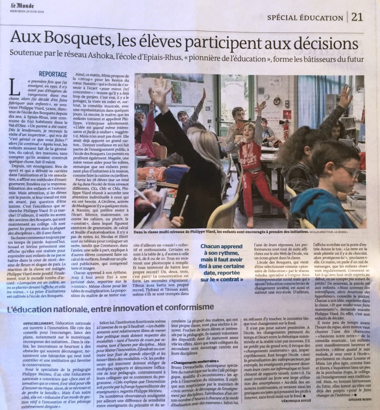Après avoir été sélectionnée par le réseau Ashoka comme pionnière de l’Education, l’école des Bosquets que je dirige a fait l’objet d’un bel article dans Le Monde de l’Education du 29 juin 2016.